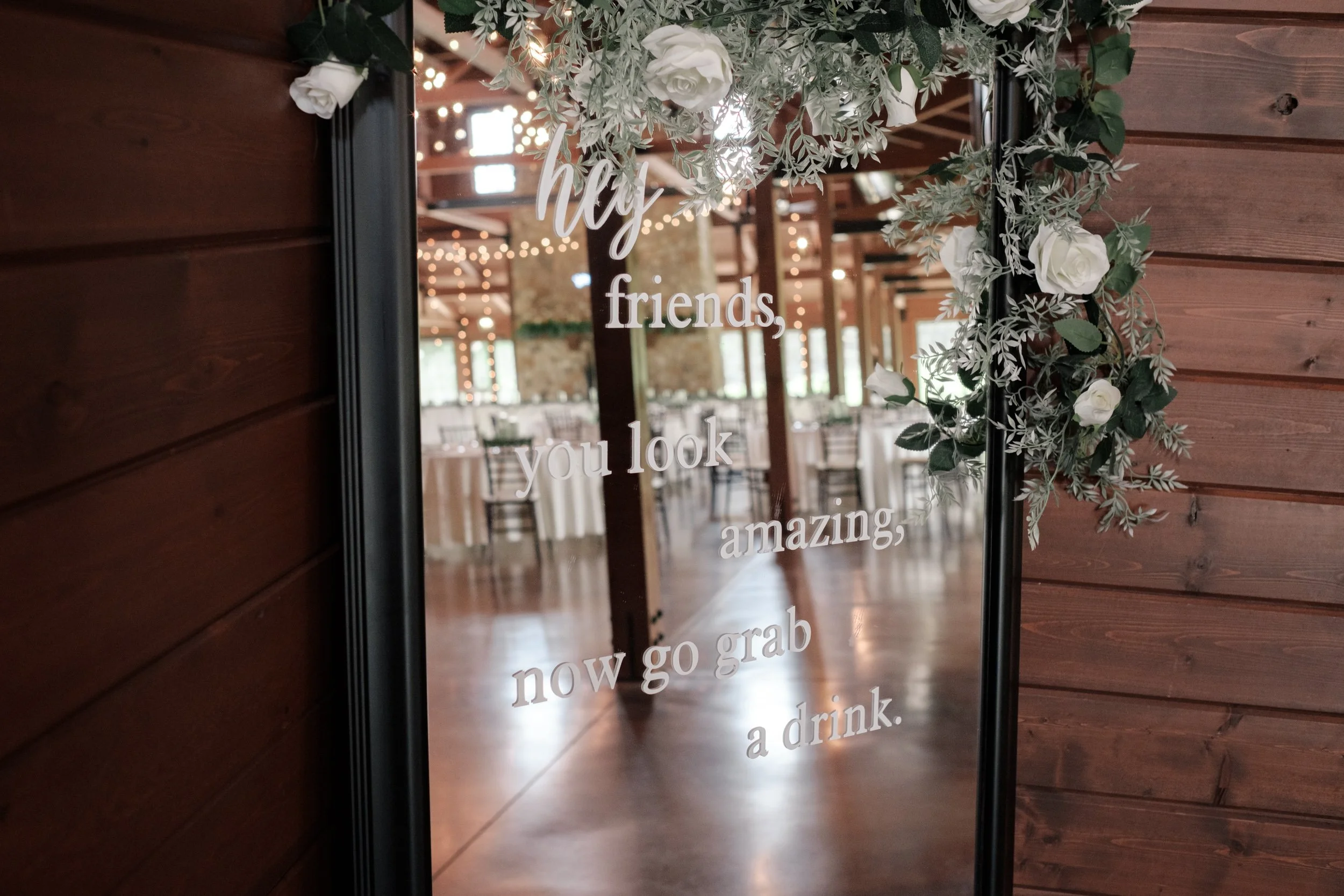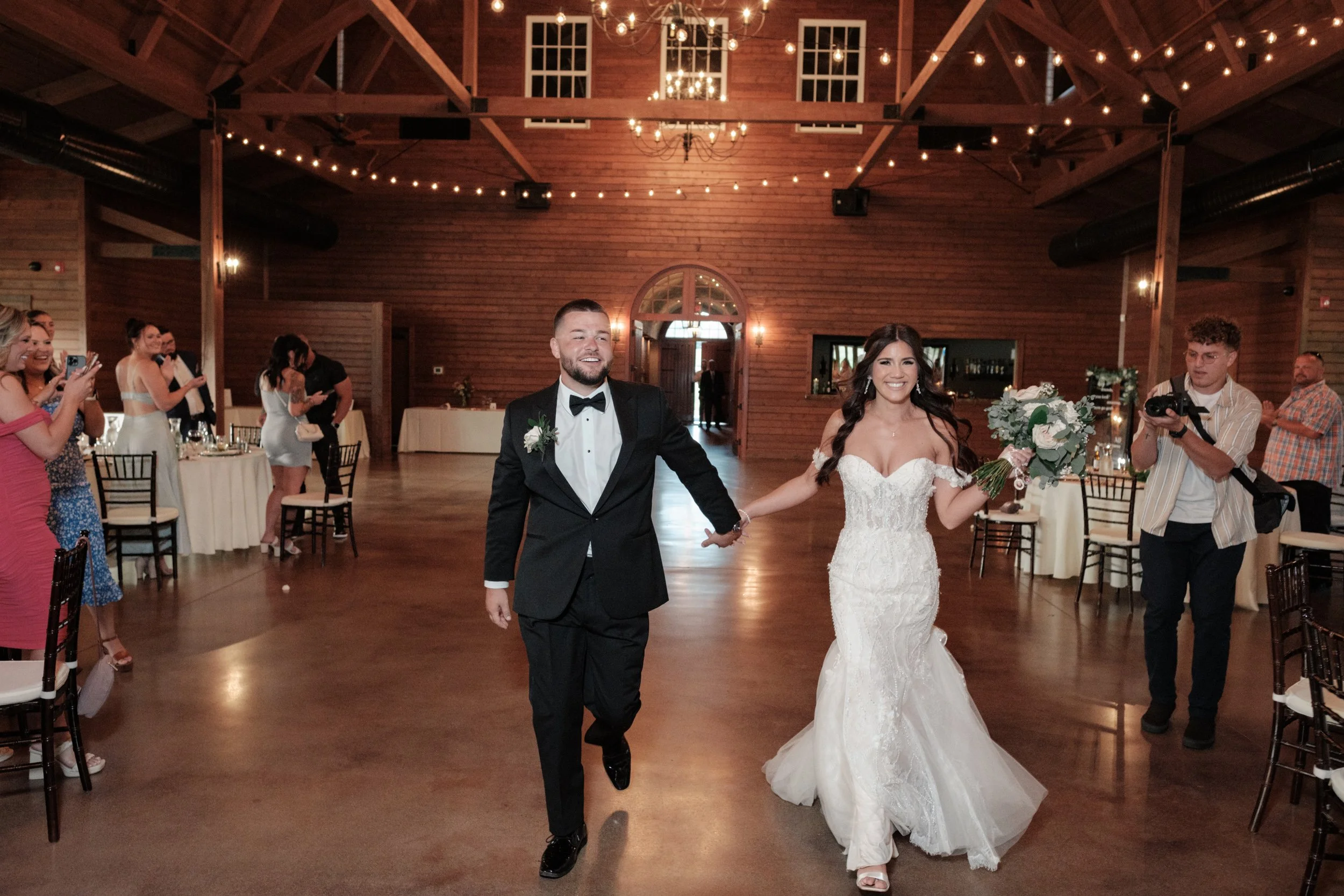 Throughout the day, intimate details adorned every corner, from the personalized Buffalo Trace bourbon to the heartfelt letters exchanged between the couple. As the sun dipped below the horizon, casting a golden glow over the festivities, Ben and Brianna's grand entrance to the reception was elevated by the magical glow of cold sparklers, courtesy of Luxe Productions. The tables were elegantly adorned with beautiful flowers and greenery from Event Florals, creating a scene of timeless elegance and romance.