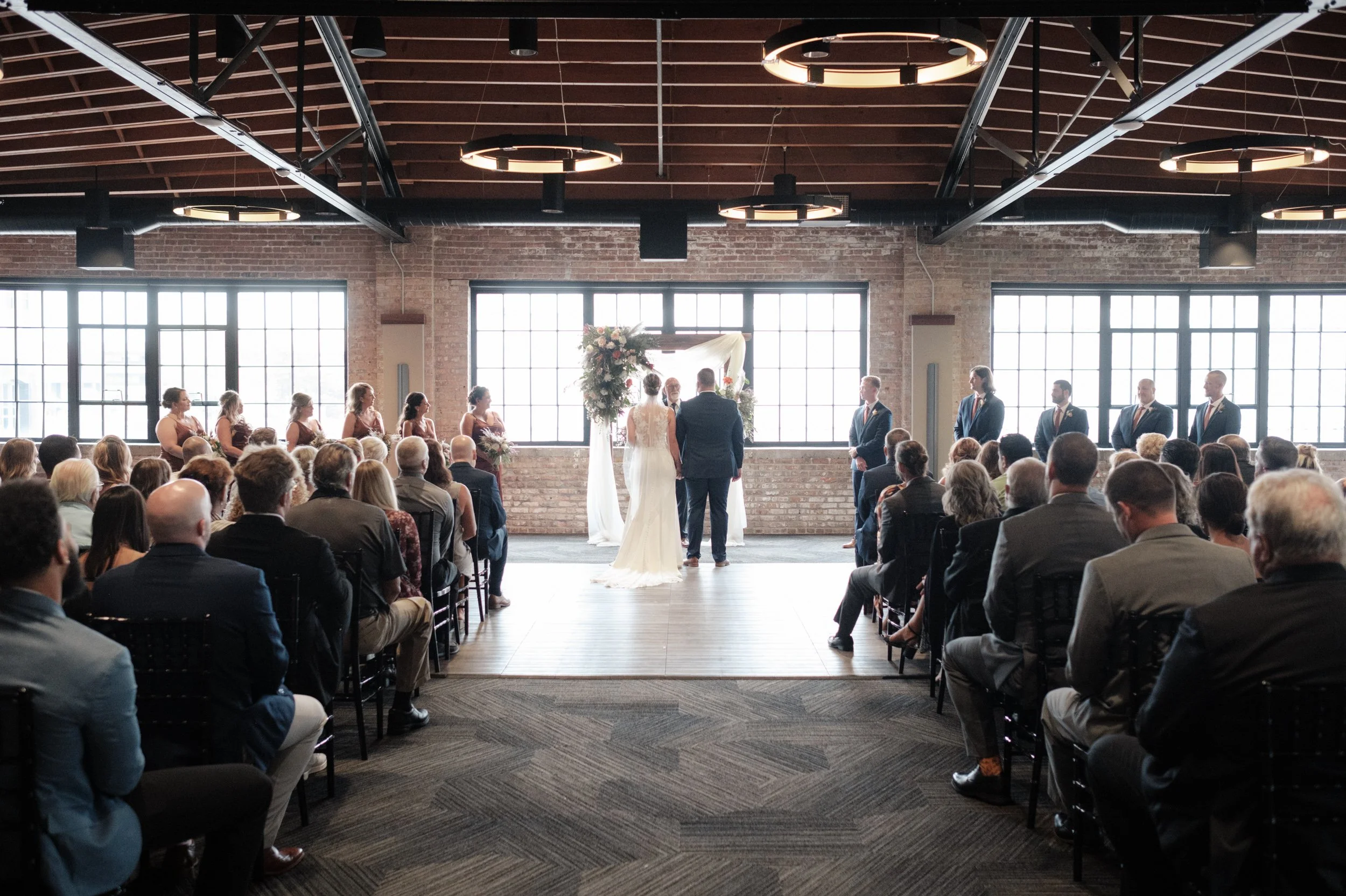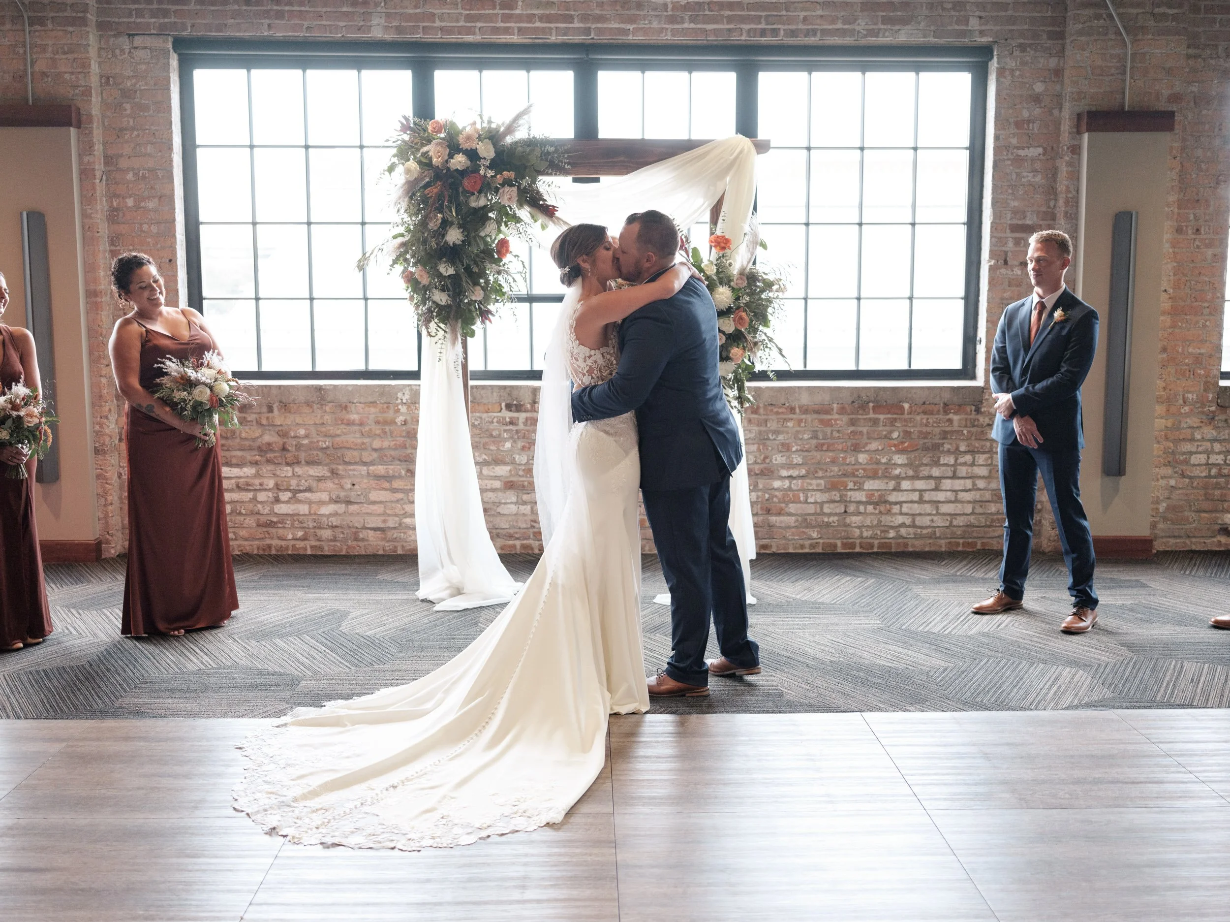 Sarah and Cody's wedding day began with both the bride and groom utilizing the spacious getting-ready space at the Rockford City Market venue. This convenient arrangement ensured that everyone remained on schedule and relaxed throughout the day. While the gentlemen savored a special bottle of Weller bourbon, the ladies indulged in champagne and shared laughter, creating memories that would last a lifetime. Before the ceremony commenced, Sarah and Cody shared a tender first look near the enchanting backdrop of Rockford City Market. Against the backdrop of brick, ivy, and teak wood, their love blossomed, illuminated by the warmth of the autumn sun. It was a moment of pure magic, captured forever through the lens of B. Adams Photography.