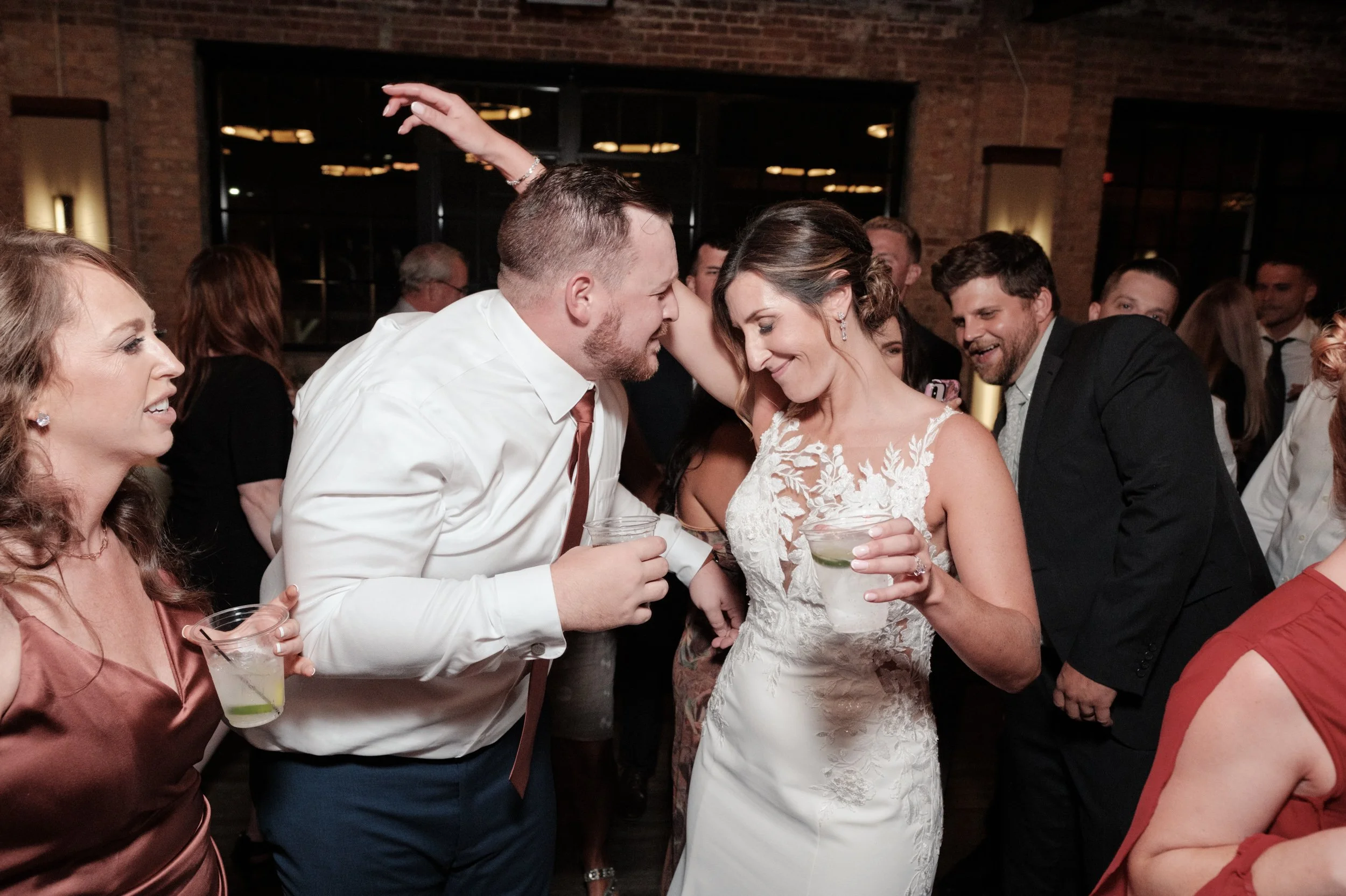 Following the ceremony, Sarah and Cody stole away for a quick trip to Sinnissippi Gardens, where the beauty of nature provided a stunning backdrop for their wedding portraits. Amidst the vibrant fall foliage, they embraced, their love radiating with every glance and touch, immortalized in timeless photographs. Upon their return, Sarah and Cody made a grand entrance at the Rockford City Market venue, greeted by cheers and applause from their loved ones. The reception was a celebration of love and joy, filled with laughter, heartfelt speeches, and unforgettable moments. Luxe Productions kept the dance floor alive, ensuring that the evening was filled with music and merriment.